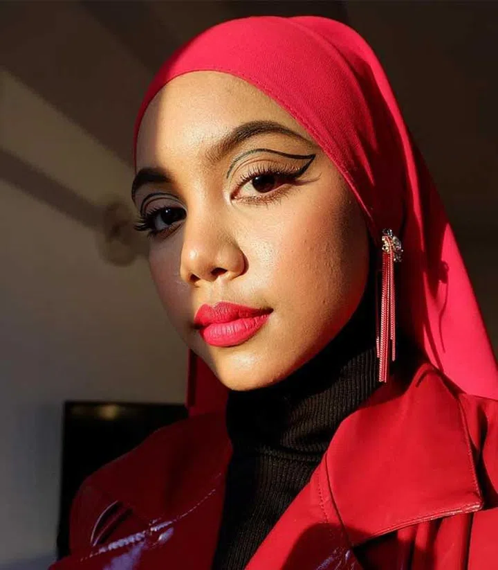 Complete your classic red lipstick hijab makeup with a pair of dramatic, red earrings. Option to wear a dress, top, or jacket with some hints or red in it. Otherwise, wear a black top and pants, and throw on a full, red jacket like this lady did for maximum impact. Voila!