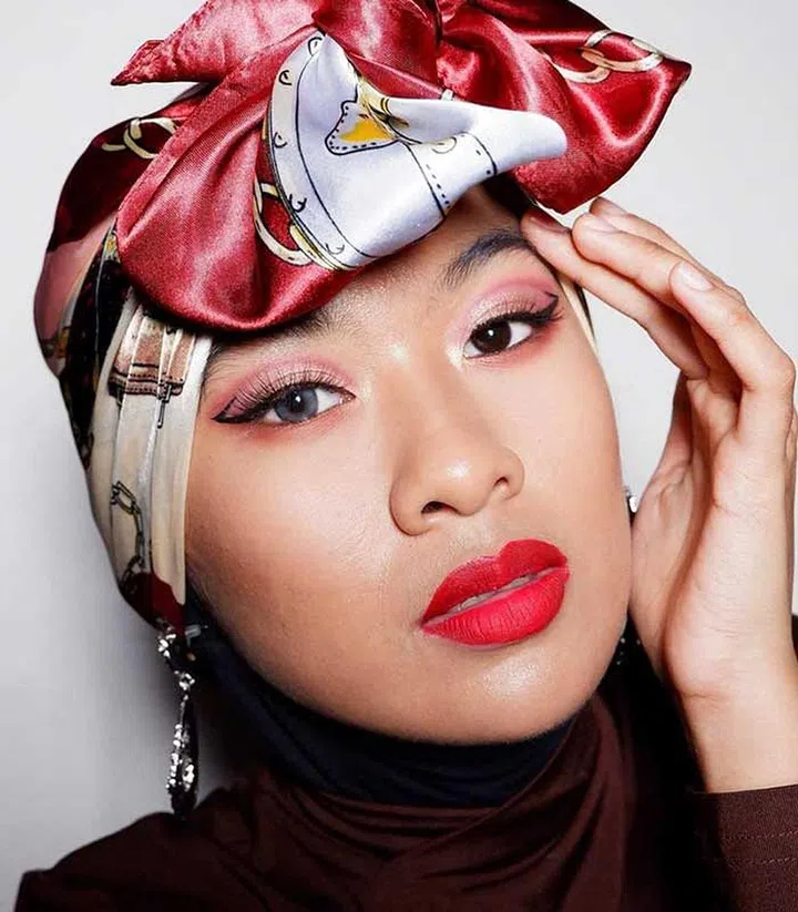 Get a tube cap, tuck your hair in. Now, tie your patterned scarf of choice and tie it up in a top-knot (or your desired style). Pick out matching eyeshadow colours, and fill up your eyelid. Now, spice your eye makeup up with a half hook cat eyeliner. Complete the look with the usual contour, highlighting, and your favourite red lipstick.