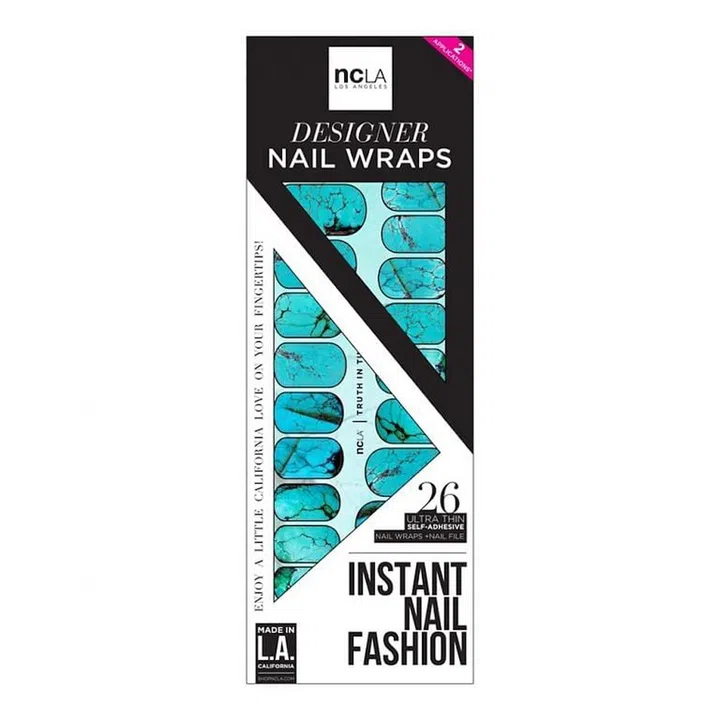 Wear: Now you can experiment with nail art in minimum time and effort, thanks to NCLA Semi-Precious Nail Wraps in Truth In Turquoise, $23. All you have to do is clean your nails, fit these nail stickers over your nails and trim off the excess.