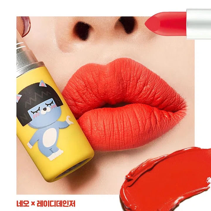 Want a red that's brighter than your car's headlights? You'd love this coral red that's paired with Neo, a cat character. She is the resident fashionista among the group, so if that sounds like you, you need to own this lipstick!