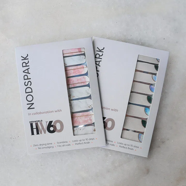 HW celebrates 60 years with this collab with home-grown nail wraps brand Nodspark. Self Love (top) features rose quartz for emotional healing and love + howlite to let go of unnecessary attachments. Power Boost (bottom) features moonstone for patience and trust in your intuition + malachite to inspire leadership and confidence.