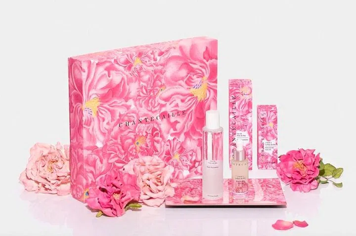 Chantecaille has worked with home decor artist John Derian to launch a limited edition set that is sold at the flagship store. The line, which drops yearly, is centred around the Rose de Mai and features elegant rose-inspired bottles and trays.