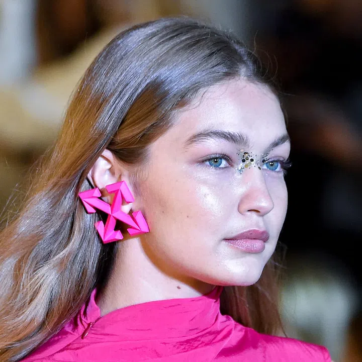 According to Off-White, glitter on the eyelids is so passé. Instead, chunky glitter is placed across the nose bridge, with the rest of the face kept clean for maximum impact. Now, that’s a look.