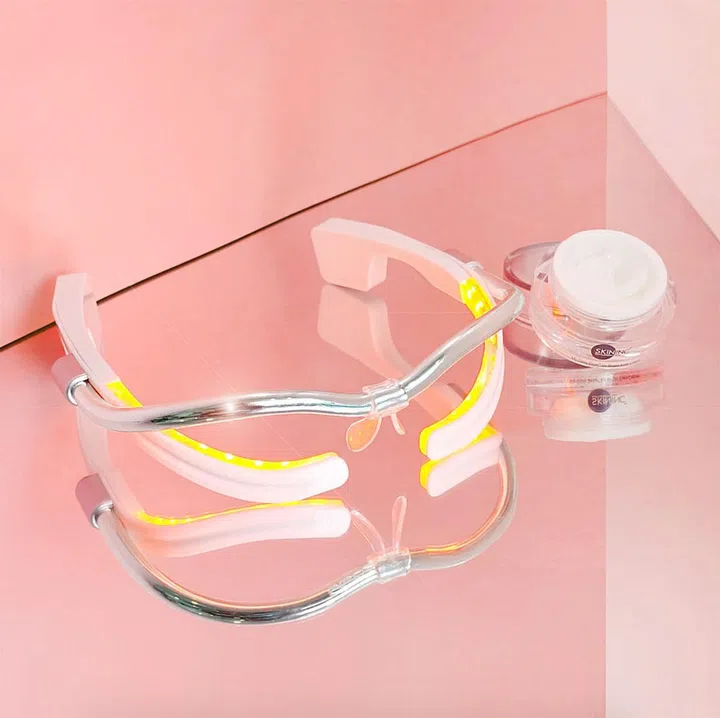 It looks like a pair of really cool sunglasses sans the lenses. Instead, there’s a strip of LED lights just under each eye, in three colours: red to minimise fine lines around the eyes, yellow to brighten dark circles, and orange, which combines the benefits of red and yellow light.