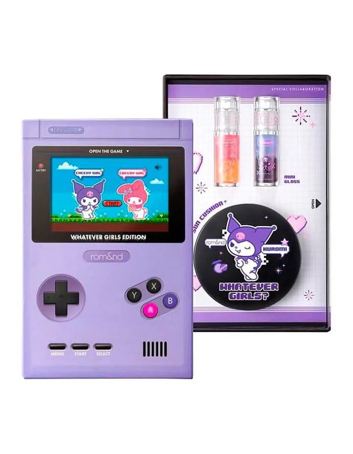 In true Y2K fashion, rom&nd brought back the old school handheld game console, the Game Boy, and made it into a limited edition set that got us all greedy for more. When receiving it for the first time, it may feel much like unboxing one of those really creative CD album cover designs, but the real anticipation unfolds when the box slides out to reveal a star-studded line up of two mini glasting water gloss lip toppers, as well as a SPF50 PA++++ sun cushion. The clear, high shine glosses come in subtle coral and a darker, plum shade, which is a consistent theme for this Sanrio collaboration. The sun cushion however, steals the show with its lilac Kuromi silhouette. When applied, the lavender helps to cancel out dullness on skin and reveals a brighter looking, toned-up complexion while shielding you from harmful sun rays.