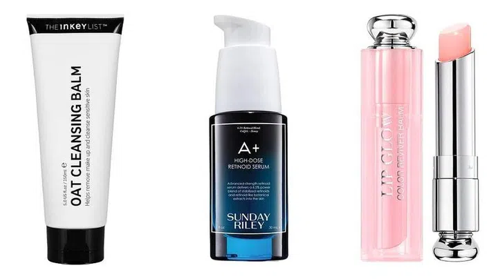 Products (L-R): The Inkey List Oat Cleansing Balm ($15), Sunday Riley A+ High Dose Retinoid Serum ($128), Dior Lip Glow in Pink ($50)