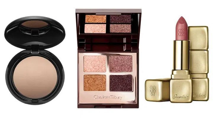 Products (L-R): Pat McGrath Labs Skin Fetish-Sublime Perfection Blurring Under-Eye Powder ($46), Charlotte Tilbury Luxury Palette of Pops Eyeshadow Palette ($90), Guerlain KissKiss Matte Lipstick ($53)