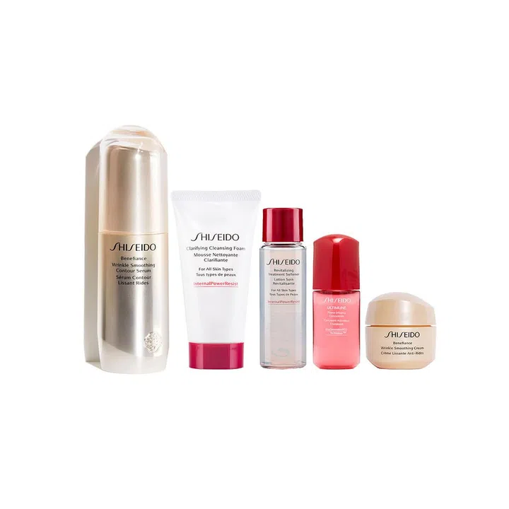 Bothered by wrinkles? Look to this Shiseido Wrinkle Smoothing set that targets fine lines. Its star product is none other than the Benefiance Wrinkle Smoothing Contour Serum which contains retinol ACE, a retinol derivative that boosts our skin’s collagen production, ironing out fine lines and wrinkles.