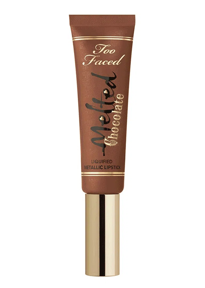 This wouldn’t be a chocolate lipstick roundup without mentioning this Too Faced collection. These lipsticks not only contain cocoa powder, they also smell amazing. All the shades are some variation on a chocolate colour, and you can choose between a melted finish or a metallic one. They come in really handy squeeze tubes with a built-in sponge-tip applicator so you apply it straight to your lips like a gloss.