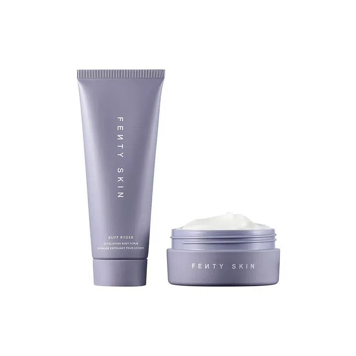 Your skin has the same needs all over and your body deserves the same tender love and care as your face. To achieve skin that's smoother and more supple, peep Fenty Beauty's The Body Duo. Within the set, you will find a mini exfoliating body scrub and a whipped body cream to buff away rough-feeling texture and provide nourishing hydration for smooth, soft, supple-feeling skin.