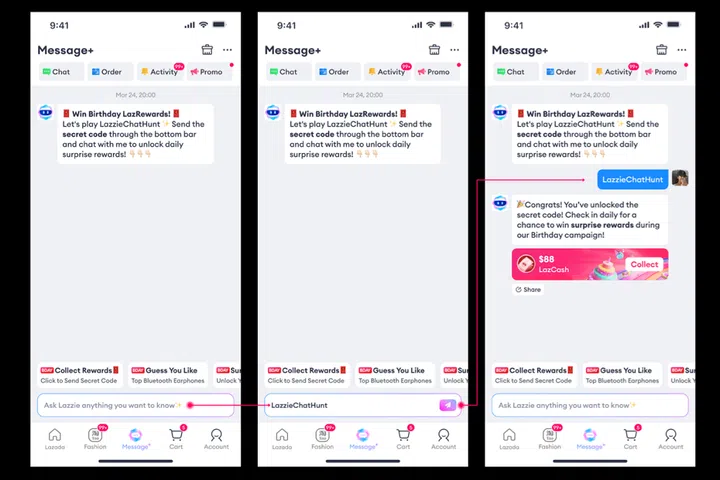Pro tip: Key in the secret code “LazzieChatHunt” on Message+ for a chance to win up to $88 LazCash!