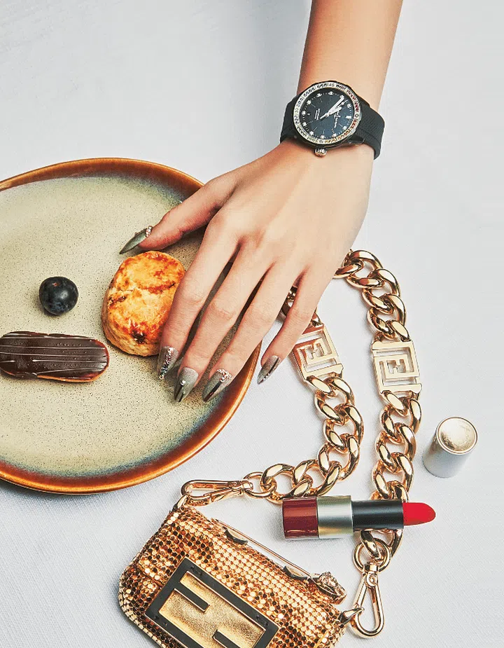 Rouge Hermes Lipstick, $118. Lady Diver Rainbow 39mm watch, Ulysse Nardin. Bag, Fendi
