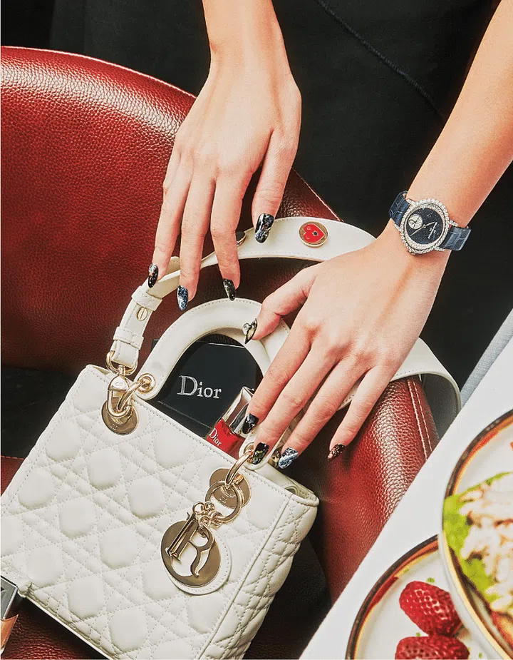 Dior Beauty 5 Couleurs Couture Rouge, $113, Rouge Dior, $63, Dior Vernis in #864 Fortune, $43, and Dior Vernis in #309 Cosmic, $44. Cat’s Eye Day & Night High Jewellery watch, Girard-Perregaux. Bag, Dior