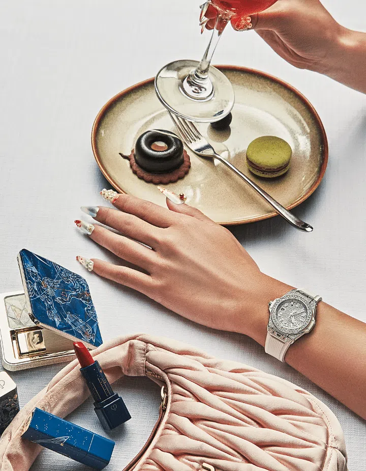 Chanel Beauty Rouge Allure Laque, $56, and Chanel Beauty Les 4 Ombres 937 Ombres De Lune, $103. Big Bang Unico Rainbow King Gold 45mm watch, Hublot. Nano bag and cuff, Chanel