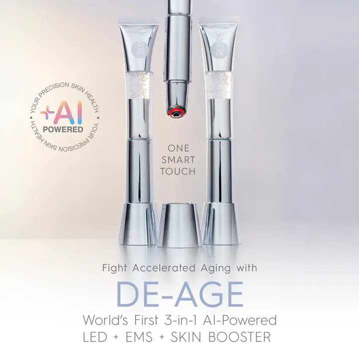 Suitable for all skin types, the De-Age LED EMS Skin Booster device combines a 20-in-1 encapsulated serum with LED and EMS technology in one sleek facial tool. This clinical-grade device works to tighten, contour, and firm the eyes, face, and neck, reducing the appearance of fine lines and wrinkles with zero downtime.