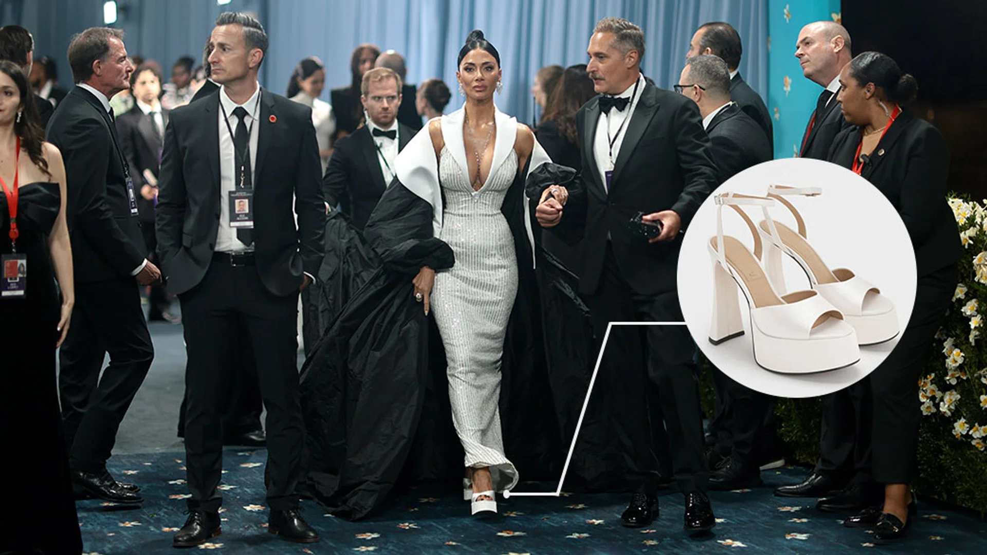 Nicole Scherzinger, who’s always one to serve drama, went for a white textured satin version of the same heels, also dressed by Prabal Gurung. What we love about it is that the platforms complemented her look and added some height to her powerful, tailored silhouette.