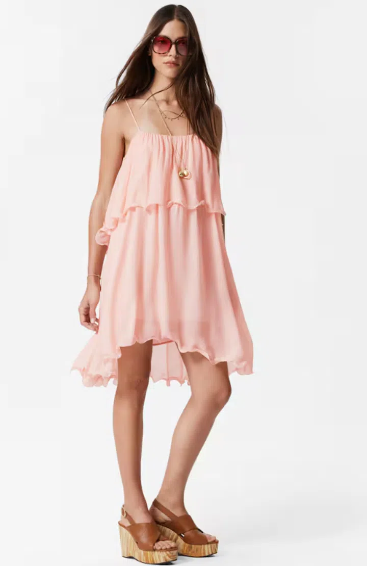 This soft chiffon mini dress features a flowy silhouette with adjustable thin straps and double-layered draped gathers that cascade into an asymmetrical hem. Accented with curled trims and a concealed side zipper, it effortlessly combines simplicity with boho-chic flair. Pair it with chunky jewelry and wedge espadrilles for the perfect look to enjoy an evening stroll around town.