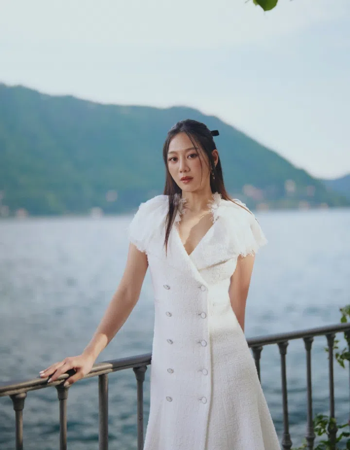 Set against the opulent backdrop of Villa d’Este, the 31-year-old radiated effortless sophistication in a knee-grazing tweed number, complete with signature button details that paid homage to Chanel’s timeless codes. Her raven hair was swept into a half-up, half-down style, secured with a dainty black bow, an understated touch that drew the eye to her luminous, rosy-toned makeup.