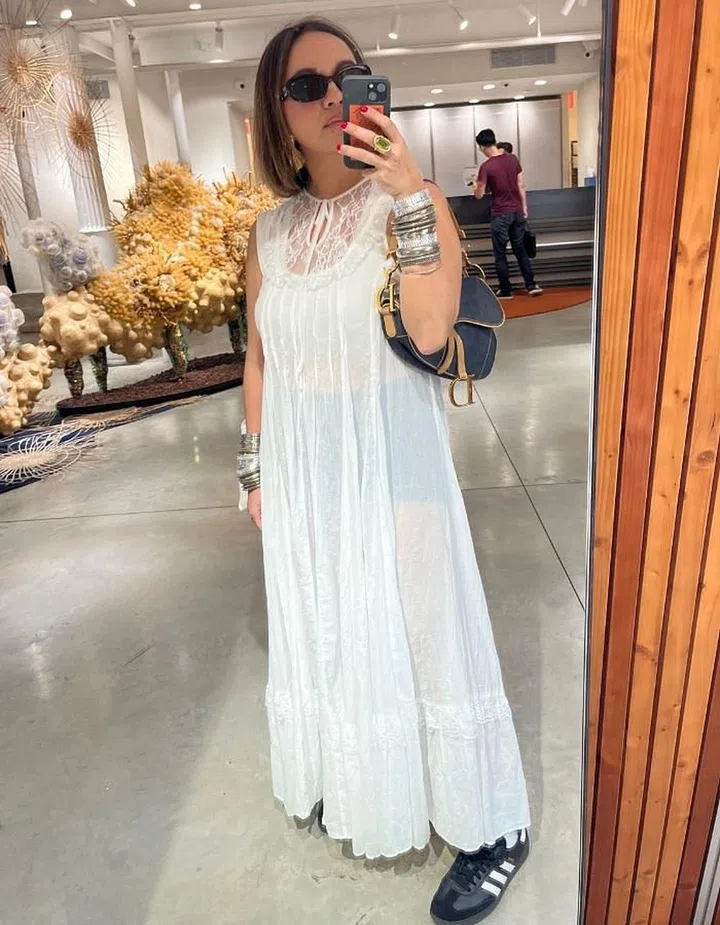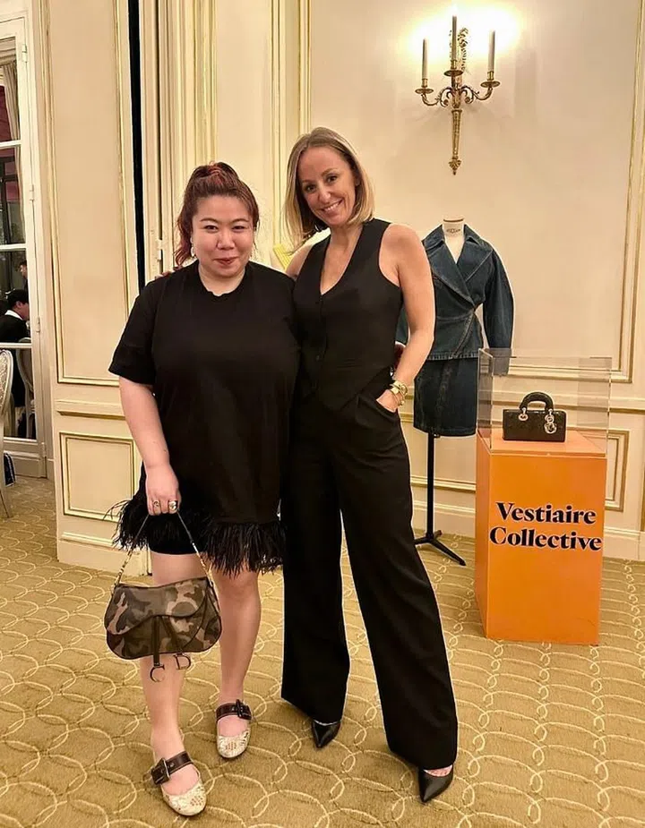 On her selection: "This Dior saddle bag was surprisingly roomy and I appreciated that I could fit in my battery pack, wifi router, wallet, phone and a whole bunch of makeup! I love finding discontinued or vintage gems like this Dior Saddle on Vestiaire Collective as it lends a unique twist to a currently popular design. It's also the perfect size for someone who's constantly on the go and was my trusty companion during the Dior spring/summer 2024 show, as well as at the Vestiaire Collective dinner where I reconnected with co-founder Fanny Moizant (pictured above)."