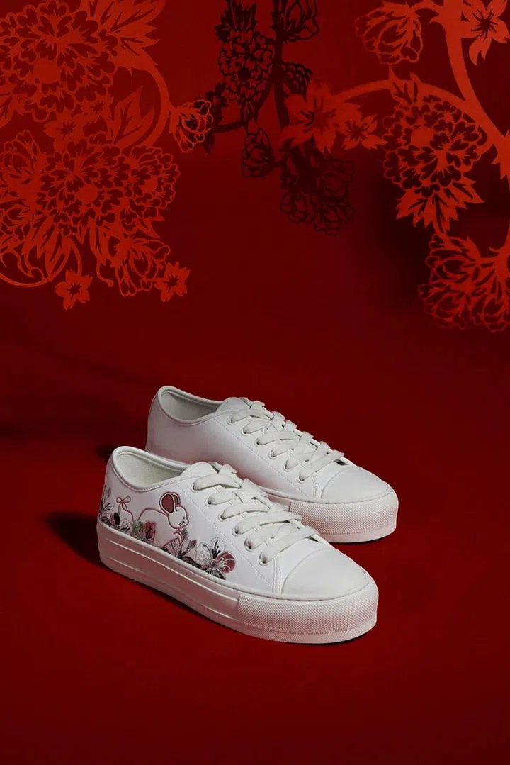 This exclusive capsule collection features cute embroidery of mice and flowers in pastel hues. We imagine these white sneakers would still look banging all year round.