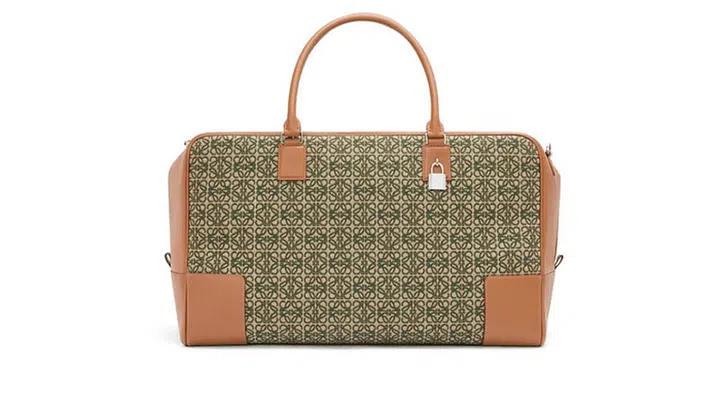 Loewe’s Amazona bag was launched in the 1970s as a top-handle bag before it got updated in larger, more travel-friendly proportions. The detachable and adjustable strap further increases its versatility as a shoulder or crossbody bag. The weekend bag is made with Anagram jacquard and calfskin trims, with protective metal feet on the base.