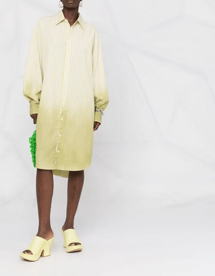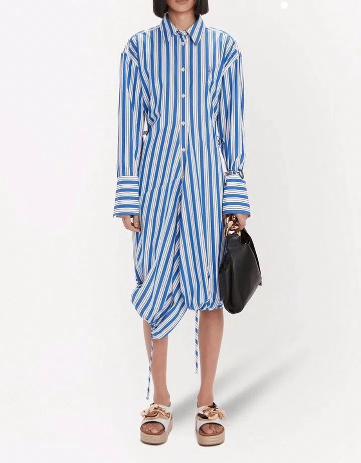 Known to subvert classic pieces with quirky details and unexpected cuts, Jonathan Anderson’s take on the timeless striped shirt dress plays with an asymmetric bubble hemline and a ruched waistline in the back.