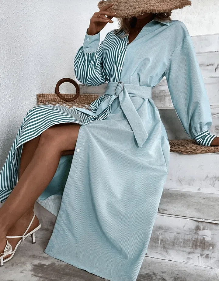 Can’t decide whether you want a print or a plain colour? Do both with this frock that mixes dusty turquoise with menswear-inspired stripes.