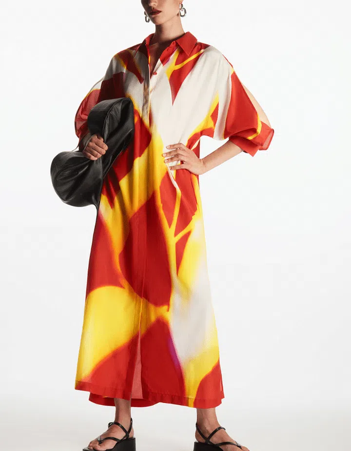 Make a hot statement in a flowing maxi shirt dress that comes in an eye-catching flame-like pattern.
