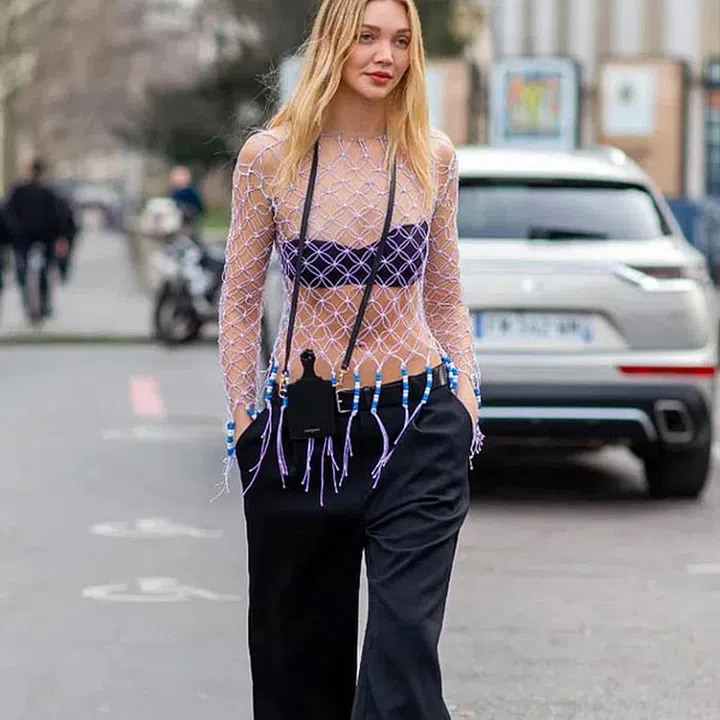 Thrown over a bra top and relaxed trousers, a netted top adds texture and sass.