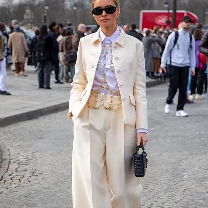 Corporate warriors can glam up a classic cream suit with an embellished harness.