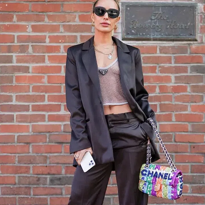 Get ready to party by swapping out a crisp shirt for a sparkly mesh top under a blazer.