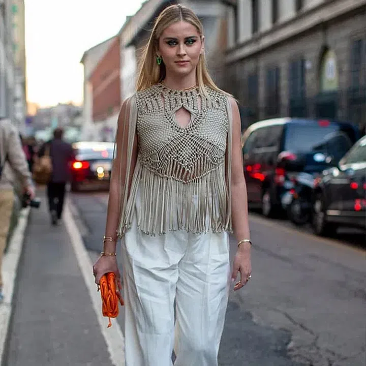 A fringed macramé tank lends a boho touch to flowy pants but would work just as well over a dress.