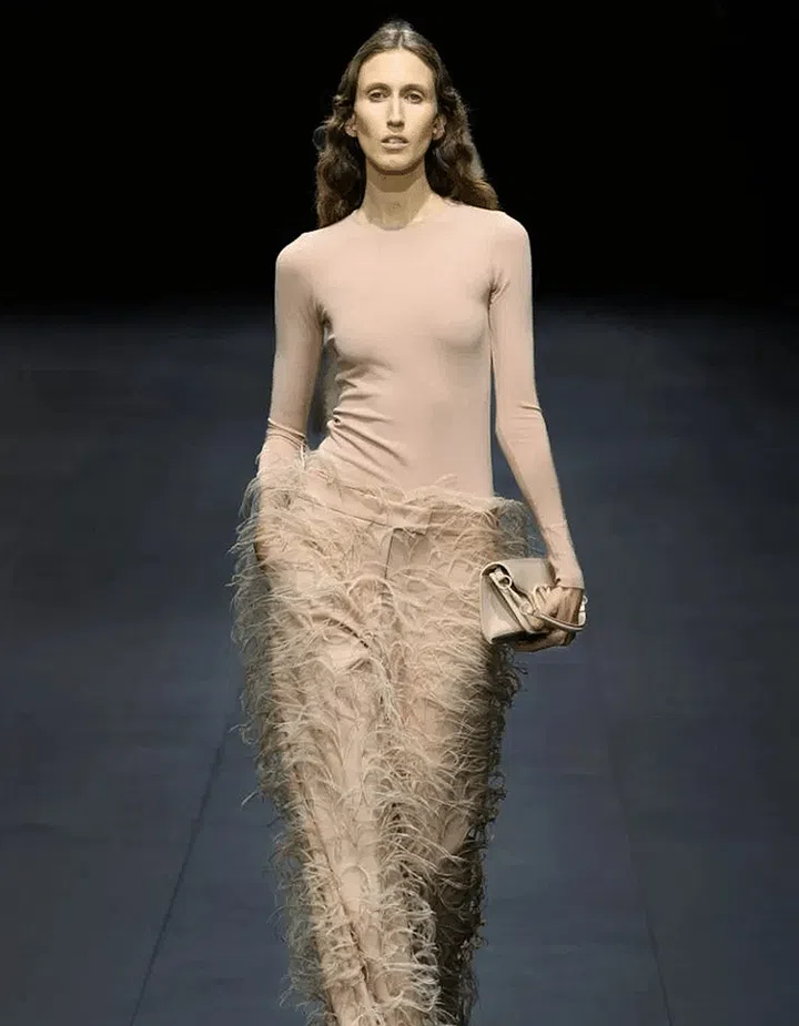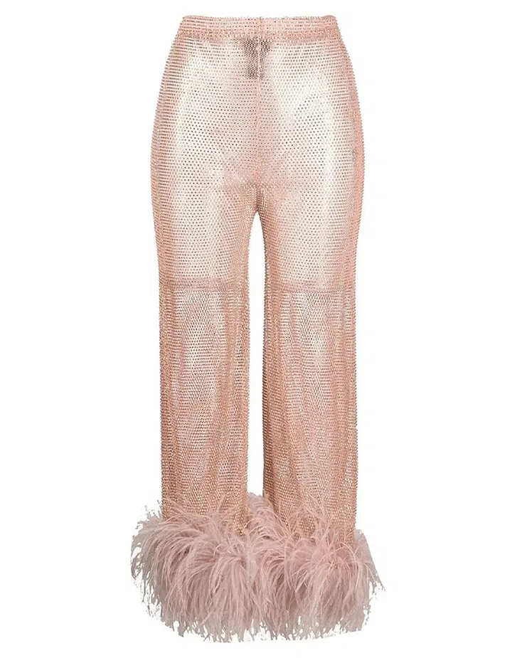 If you’re not afraid to get naked, put your best foot forward in these shiny rhinestone-embellished trousers with feather trim and look like the sexy disco ball you are!