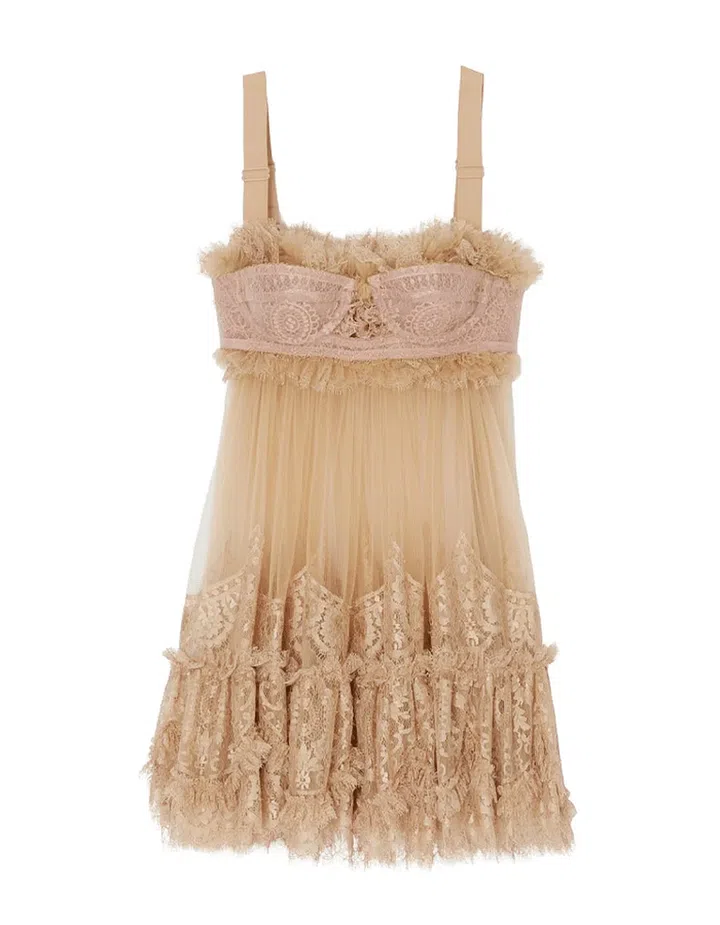 Nothing like a little lingerie to spice up your nude look. Opt for a girlish tulle and lace baby doll minidress with a layered bra top.