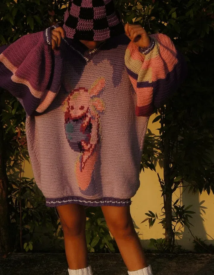 “I was already picking up arts and crafts since primary school. I used to create handmade gifts such as pun-laden cards and hand-sewn plush toys for my fellow friends and teachers on special occasions. When I graduated from Ngee Ann Polytechnic in 2020, as the a pandemic hit, I found myself in the midst of a quarter life crisis. While I was scrolling through Instagram and passing time, I chanced about a fibre art account called @artbykaraleez. Her projects included crochet graphic sweaters of Snoopy and Winnie the Pooh and I was in awe! Who knew that all it took was a hook and a ball of yarn to make magic. I started to learn basic crochet from my godmother’s mother by mimicry for a day and followed by YouTube tutorials. That eventually led to the creation of my very first sweater design – Burning Elmo. Since then, I’ve been able to sell my wares – such as my Rainbow Gummy Bear Sweater or my Axolotl Jumper to customers from Singapore and internationally.”