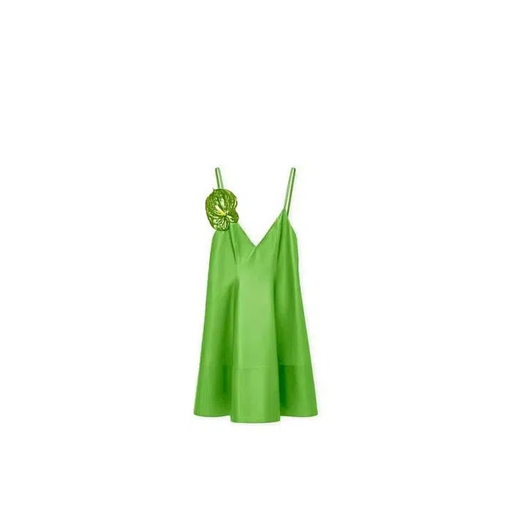 Stand out from the crowd in this flared leather dress that comes with a matching 3D printed anthurium brooch. It also comes in a equally eye-catching red version.