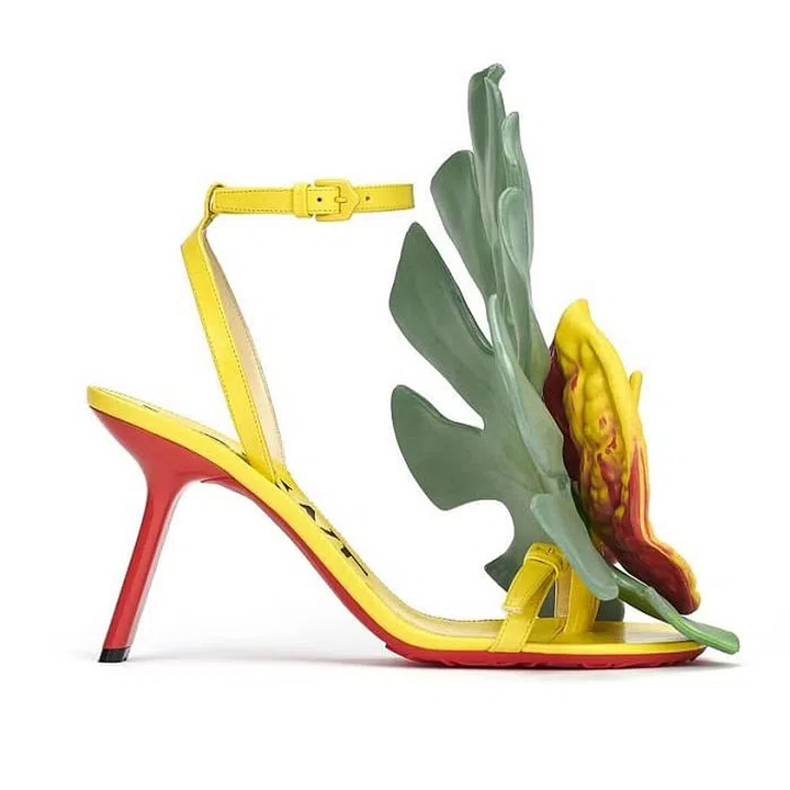 Put a tropical spring in your step with this playful monstera leaf- and anthurium-embellished heel.