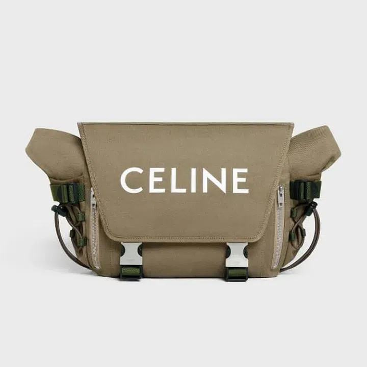 Serve the rugged look with this khaki-green messenger by CELINE. The bag features elastic pockets on the sides of the bag, which makes carrying a bottle a snap.