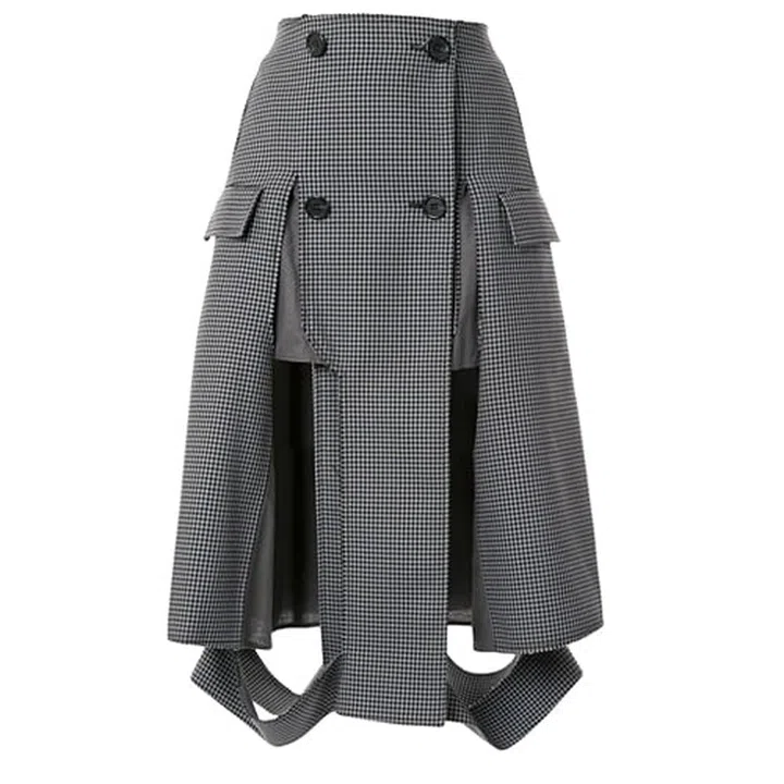 A houndstooth printed midi skirt may seem stuffy and archaic by theory, but leave it to Maison Margiela to switch it up and make it modern. Taking the anatomy of an A-line double-breasted midi skirt and deconstructing it with cutouts at the hem and two front slits that unveil an inner mini layer.