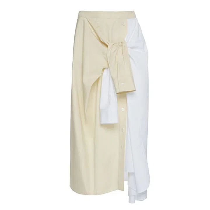 Constructing the illusion of having a shirt tied over your skirt by the sleeves, this asymmetrical skirt from Marni features contrasting buttercup yellow and white panels.