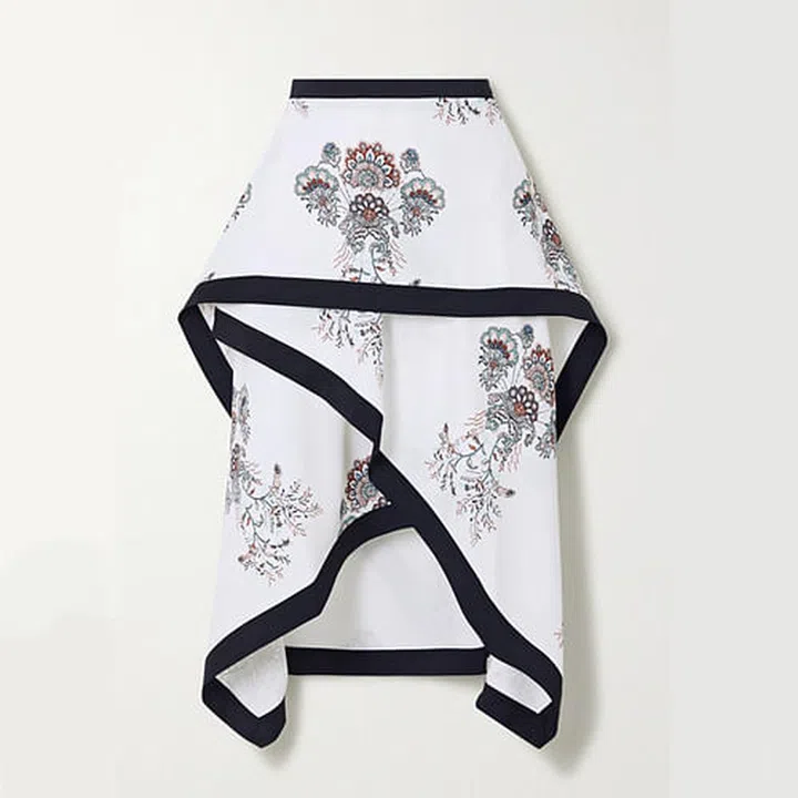 Printed with colourful and dainty paisley blooms, this skirt from JW Anderson’s SS ‘20 collection features contrasting black trimming, a multi-layered draping and a handkerchief hem.