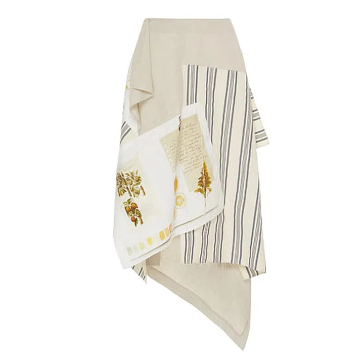 Featuring a patchwork of raw canvas-like fabric covered in stripe prints or a collage of hand-written letters and lemon trees, this lovely asymmetrical skirt will surely warm more than a few hearts.