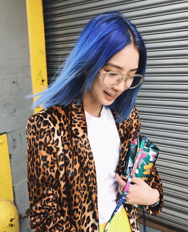 That’s exactly what model Irene Kim did at New York Fashion Week. The fashion show front row fixture pulls out all the stops to stand out in the streets with her bleached blue hair (here’s how you can make bright colours last longer on your strands), oversized glasses, leopard print blazer, floral print bag and neon yellow skirt.
