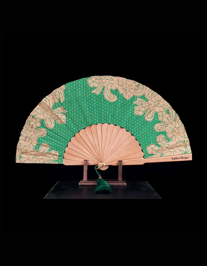 Antique silk is hand-dyed in a rich shade of green and overlaid with gold lace, lending this fan a flamenco-esque vibe.