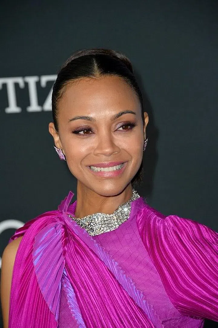 Star Lord, Iron-man and Drax’s conversation in Infinity War about Where/Who/Why is Gamora may be one of the best jokes in the movie. But Zoe Saldana’s clearly not playing when it came to her Endgame premiere look. She took the monotone look to another level with pink-purple eyeshadow and lips to match her outfit.