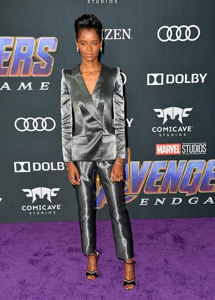 Lupita Nyong’o was a no-show to the premiere but fellow Black Panther star Letitia Wright (who plays Shuri) more than filled her shoes with this crisp, sharp silver pantsuit from Armani Privé. The peaked shoulders made the petite lady look strong and confident, and we’re obsessing over how the suit’s chevron pattern seemingly complemented the Nicholas Kirkwood sandals. Finally, she topped off her look with delicate but sophisticated Cartier accessories to score a fashion victory.