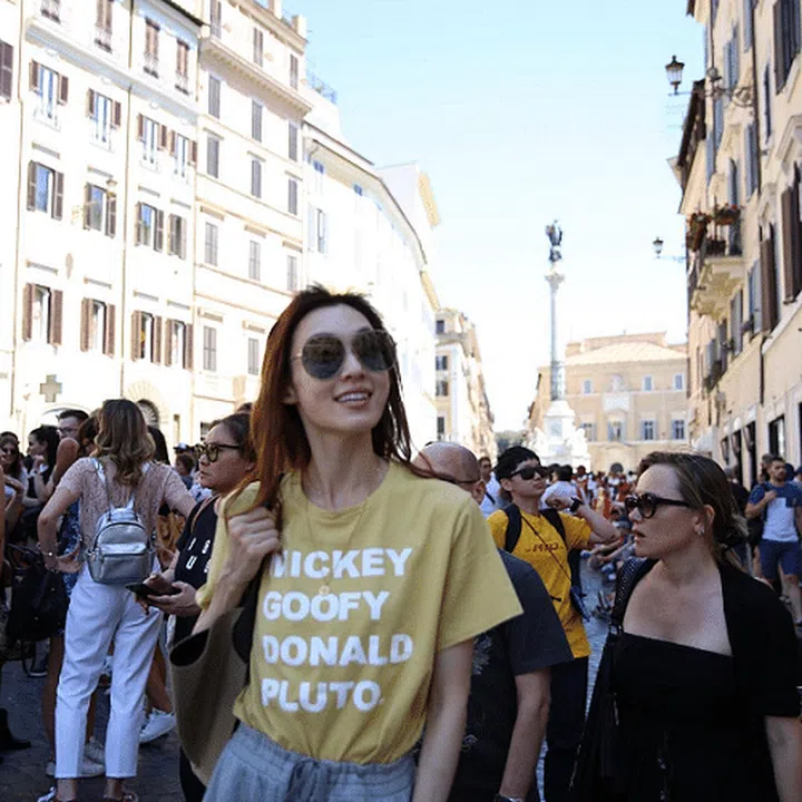 The Taiwanese singer cozies up in a playful Disney slogan tea and drawstring trousers while sightseeing in Rome. Fan Fan, who looks casually put-together, teamed her outfit with a pair of big round shades.