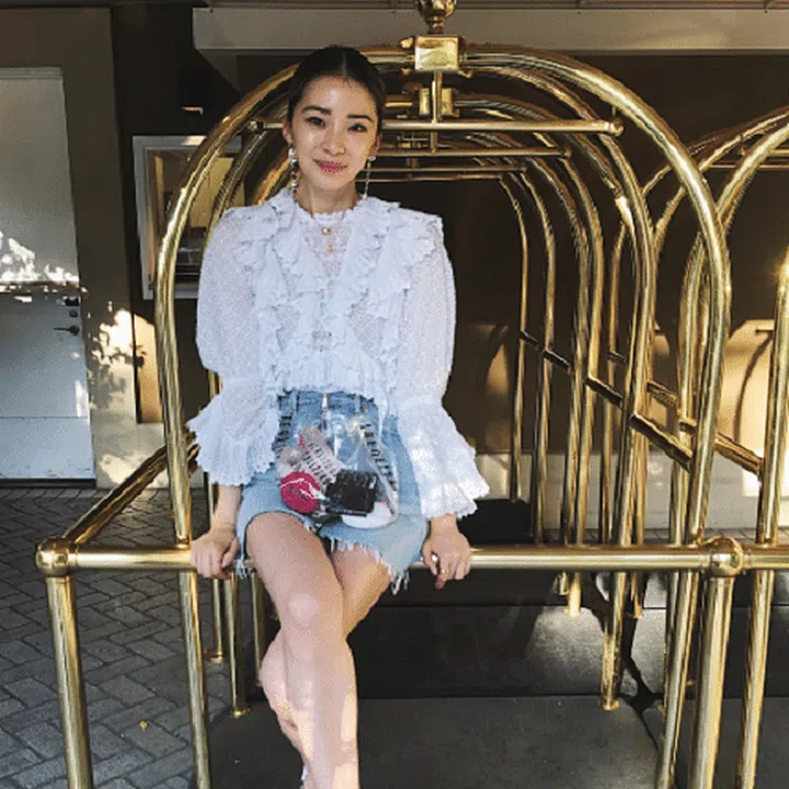 When it comes to wearing denim skirts, a rule of thumb is to keep your top simple and let the skirt steal the spotlight. Supermodel Irene Kim’s sheer Isabel Marant top gives the outfit a vintage and bohemian feel.