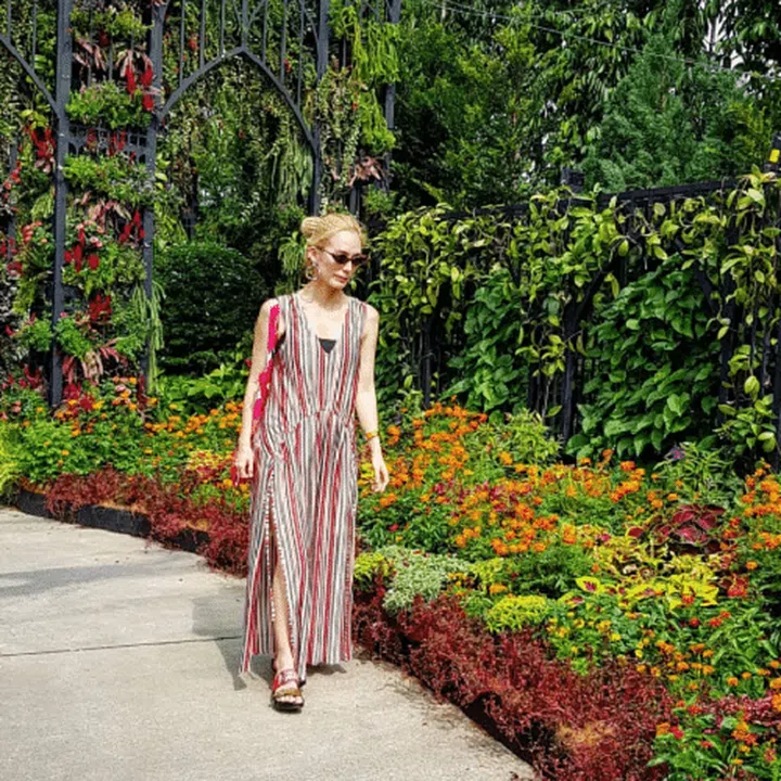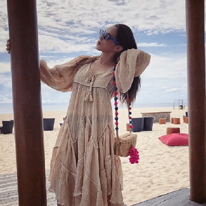 A pair of bright and bold sandals like this one seen on former actress Jacelyn Tay play up your sheer swimsuit cover-up, so you can walk out to the beach in style.
