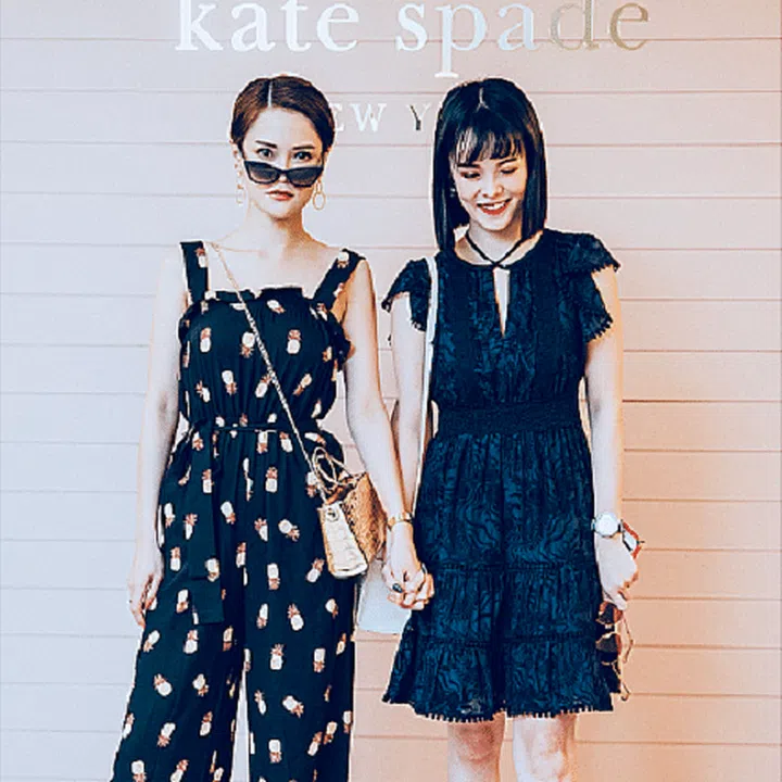 The twins posed together for a Kate Spade event. Hayley balanced out her ladylike lace frock with a pair of white trainers while Jaylee opted for a figure flattering printed jumpsuit styled with a pair of burgundy heels.